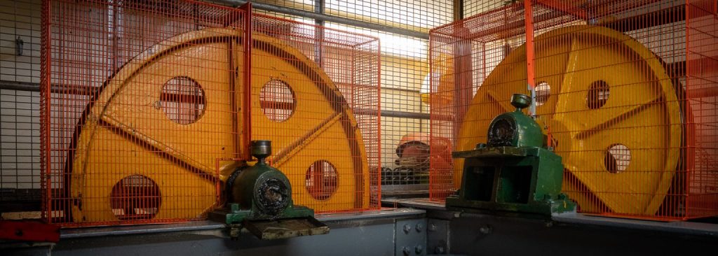 The first sub-level of the machine room houses the control panel and the hoist rope diverters. The hoist ropes are arranged in a double wrap arrangement, which means that they pass around the traction sheave twice. This is required so that adequate traction can be afforded between the hoist ropes and the sheave itself to be able to move the two lift cars. Because of the way the ropes pay off, traction sheave offset rope diverters are installed. To the uninitiated, these may appear to be leaning and incorrectly fitted but to an appreciative eye, this is actually correct engineering. There is another set of ropes attached to the bottom end of each of the lift cars, which travel over a set of diverter sheaves located under the bottom station. These ropes, known as compensating ropes, are there to maintain a balance between the two lift cars during travel.
